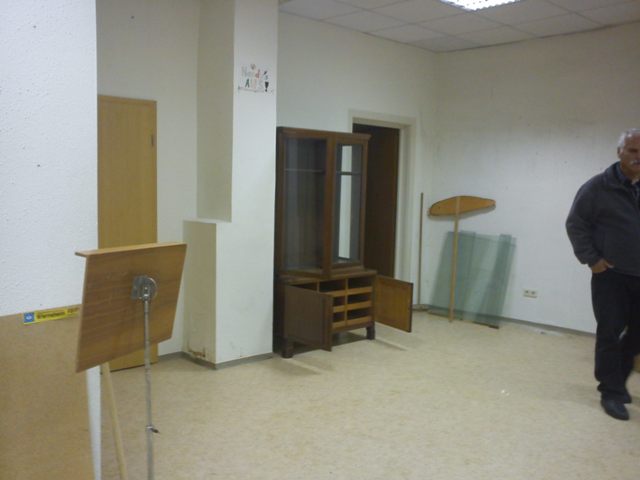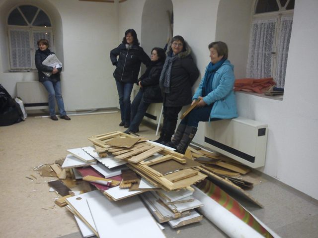 Der 1. Stoßtrupp bestand aus den Verpackungskünstlern Eva, Petra A., Gabi W., Renate und meine Wenigkeit. Es wurden die unglaublichsten Dinge eingepackt. Kurz darauf wurden wir verstärkt durch Ulli, Evi + Thilo, Antje + Thomas U. und Gerhard. Nur einer kam mit der Notenmappe unterm Arm und wollte singen: Peter B. aus P. Wir dachten nur: "Gott sei Dank, Männer". Wir benötigten ja ordentlich Muckis um die vielen Kartons in Keller bzw. ins Forsthaus zu schleppen. Also lieber Peter, nix mit Singen sondern schaffen, was er auch ganz fleißig gemacht hat. Thomas U. schleppte "schwere" Noten die steilen Holztreppen hoch und brachte dabei seine erst grade wieder fit gemachten Lungenflügelchen zum Pfeifen und Gerhard tobte sich gnadenlos an hilflosen Schränken aus. Thilo dagegen baute den Schrank mit viel Gefühl auseinander und bekommt bestimmt noch den goldenen Kehrwisch verliehen, weil er alles so sauber gefegt hat.