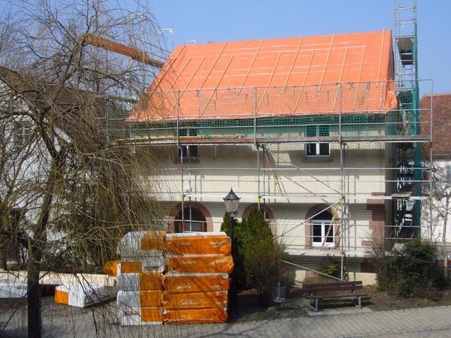 In den letzten 14 Tagen konnte jeder aufmerksame Beobachter reges Treiben beobachten. Das Dach wurde abgedeckt und mit einer neuen Plane versehen. Balken und Isoliermaterial stapeln sich im Innenhof.