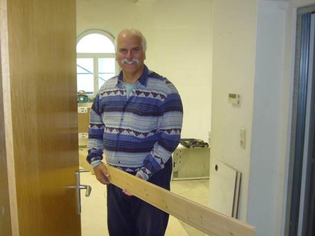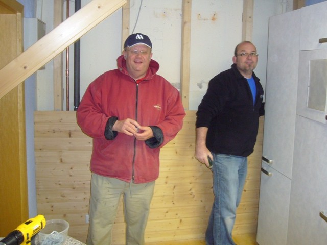 Mit viel Spaß bei der Arbeit haben wir die Holzverkleidung wieder montiert und den Apothekerschrank auch wieder an den richtigen Platz eingebaut.